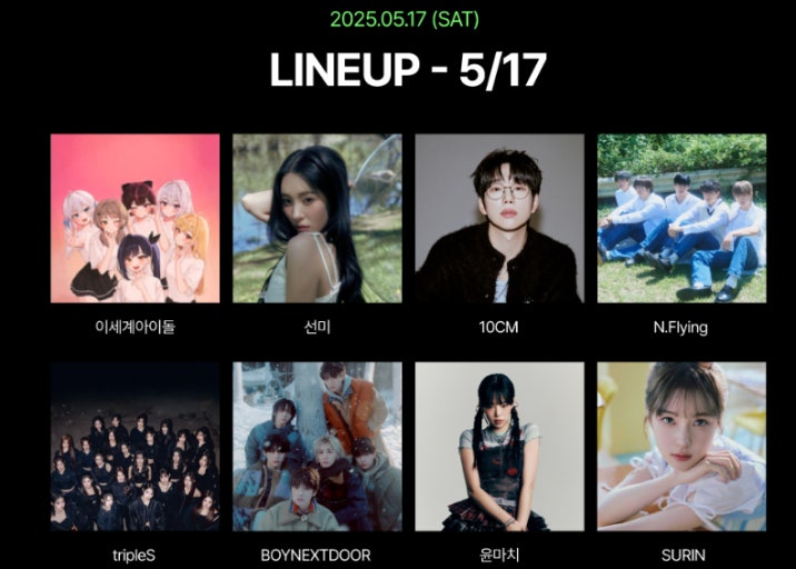 5월 15일(목)에는 K-POP 씬에서 다양한 인기를 끌고 있는 아티스트들이 출연합니다. 첫날의 라인업은 다음과 같습니다: